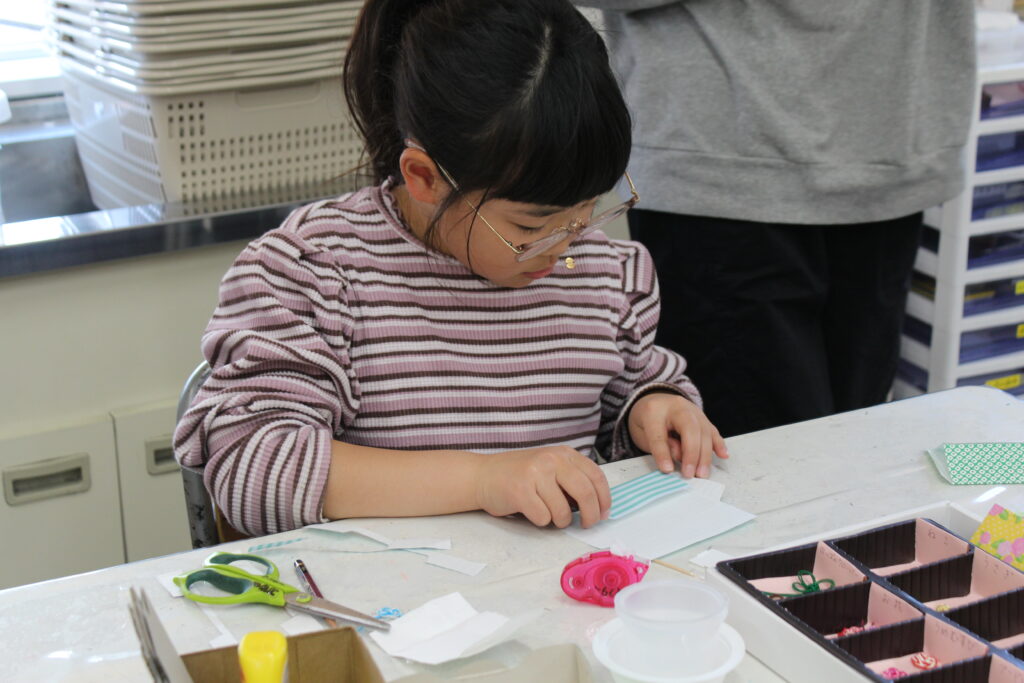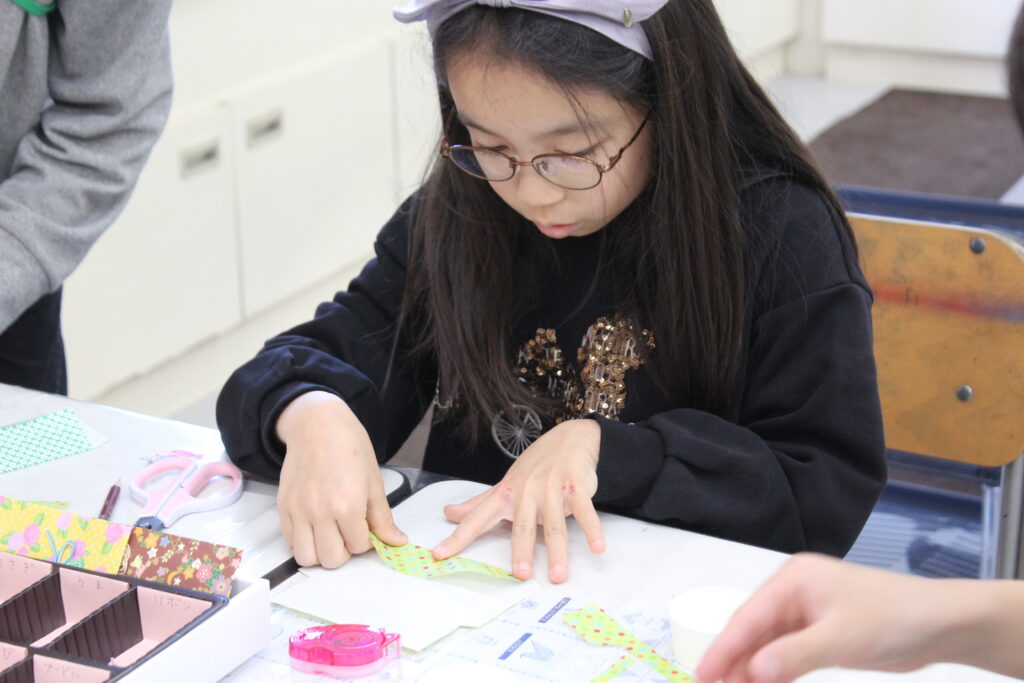 好きな柄の紙を選び、封筒の形に切り取って、丁寧に貼り付けていきます。