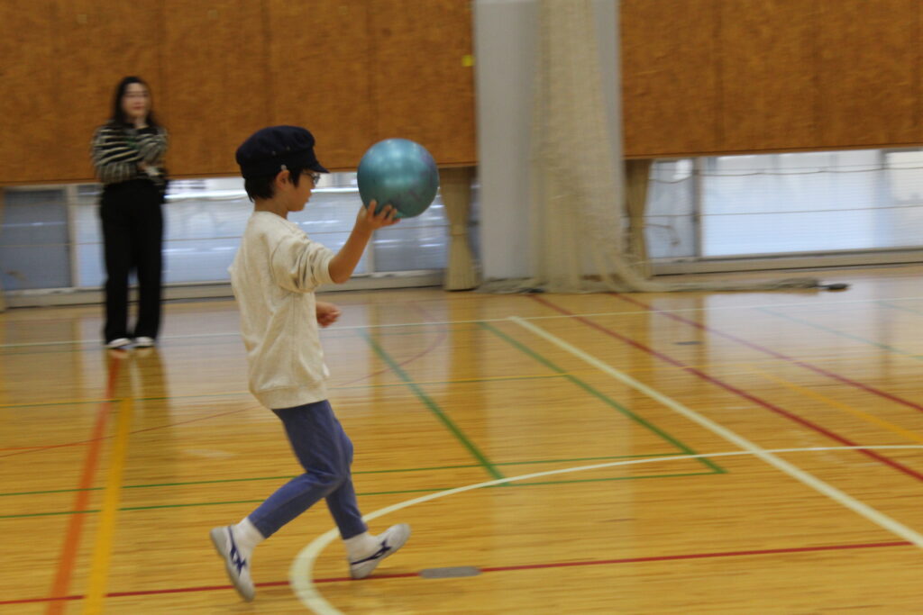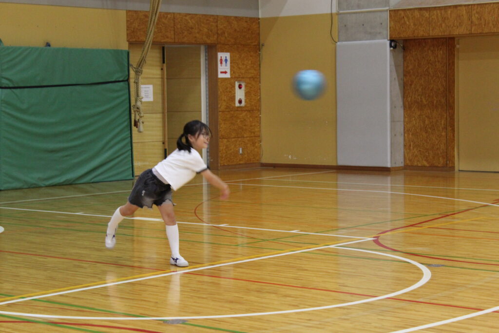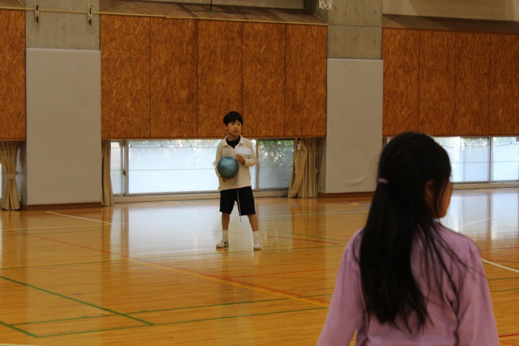 大きな体育館を使って、思いっきりボールを投げ合います。