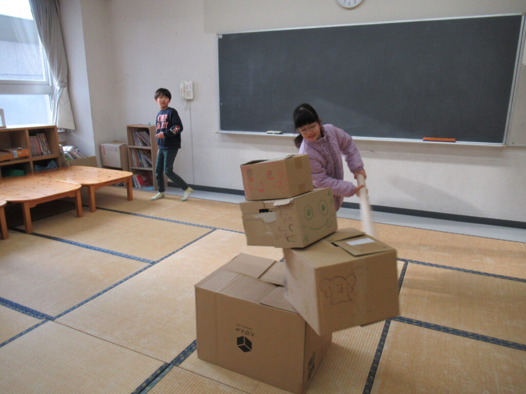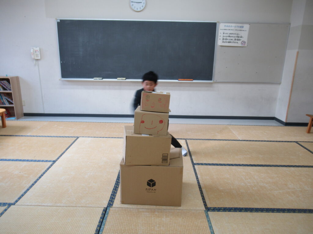 巨大だるま落としは、大きなダンボールを使って遊びました。大きくなると力が必要なので、みんな力いっぱいダンボールをたたいて上手に落としていました。