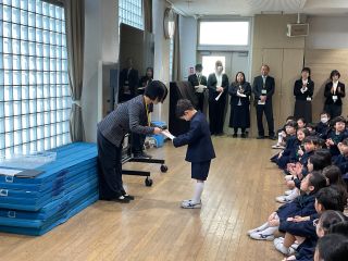 その後、5年生の指揮と伴奏のもと全員で校歌を歌い、さらにこの1年間の皆勤賞・精勤賞の表彰も行いました。名前を呼ばれるたびに「おお!」と拍手や歓声が。代表として表彰された子は、少し緊張しながらも何とも嬉しそうな表情を見せてくれました。