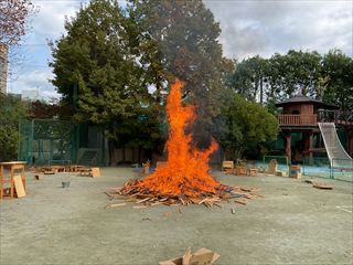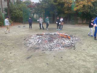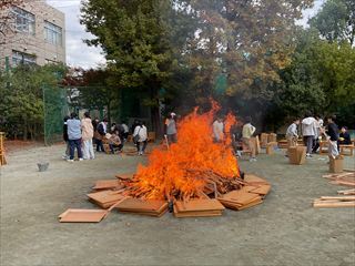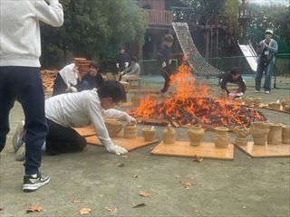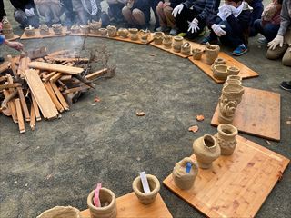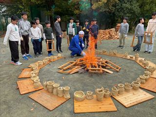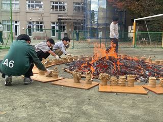 毎年秋に校庭で野焼きをします。6年生が図工の授業でつくった土器を、本物の炎の熱で焼成する、焼き物の原点を体験する授業です。