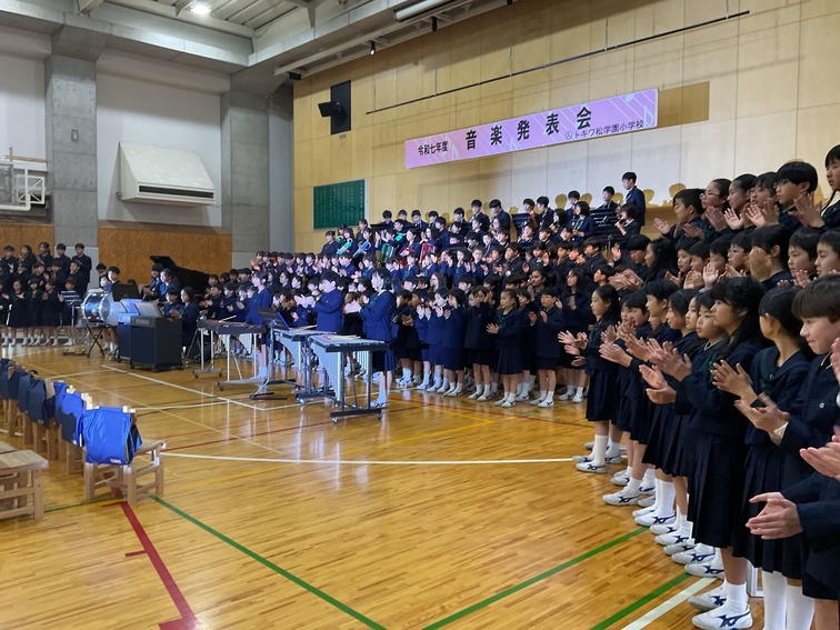 本校体育館に児童全員と保護者の方が集まり、音楽発表会が行われました。